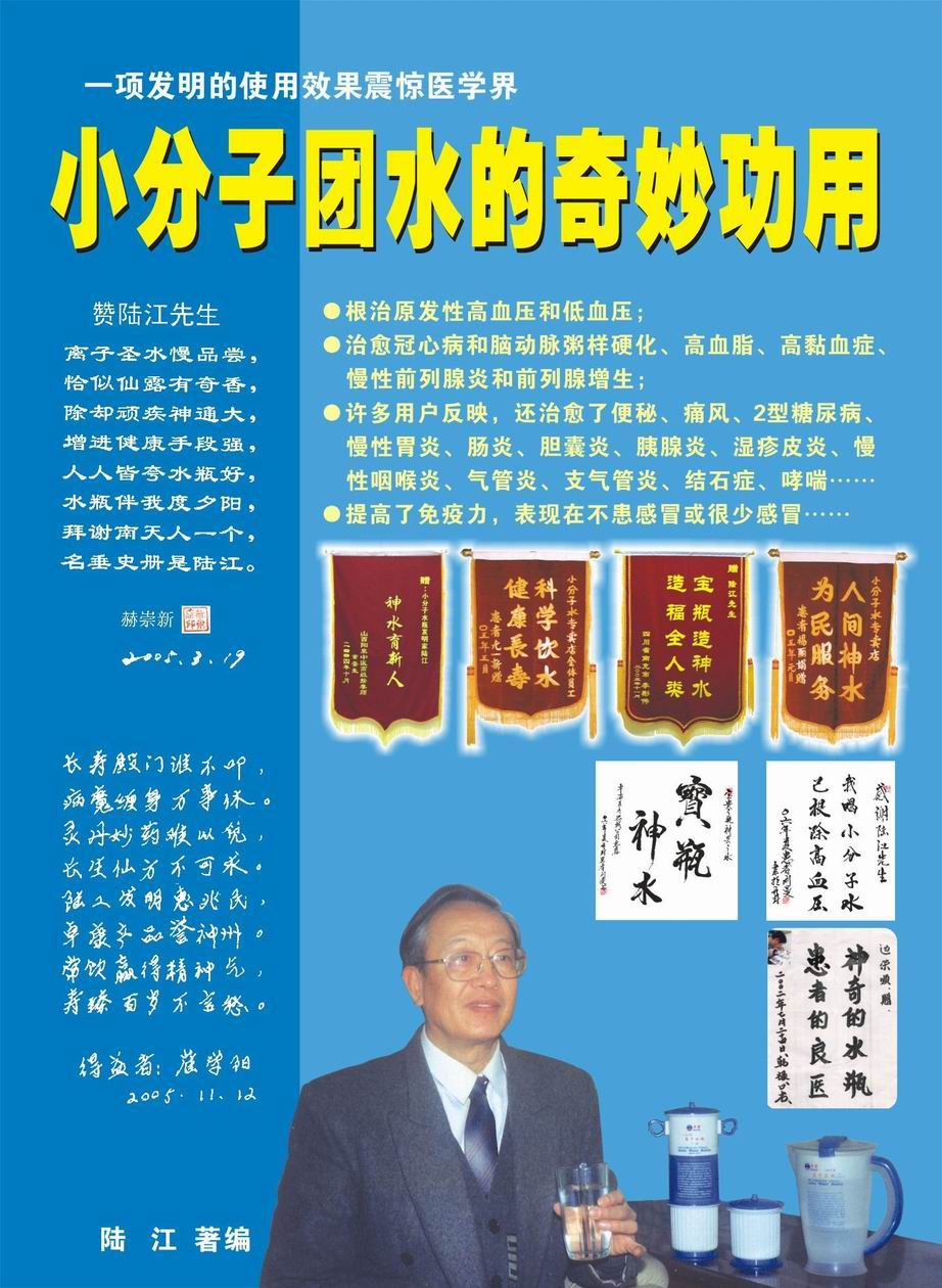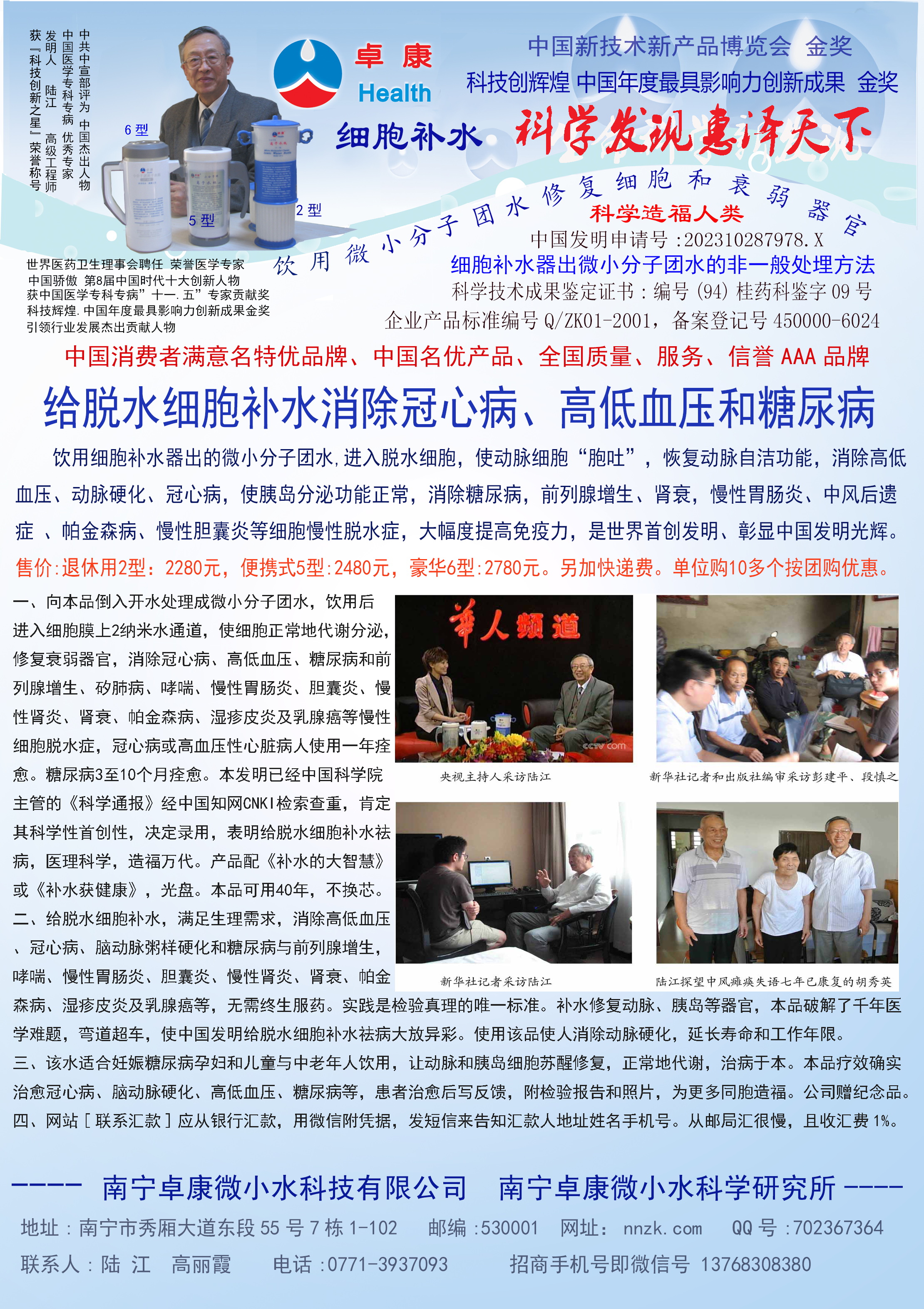 人類幾千年來患以上病癥需終生服藥,幾十年也不能治愈??墒俏覈?guó)南寧的高級(jí)工程師陸 江,于1990年想根治高血壓,研究發(fā)明了離子水瓶,處理出微小分子團(tuán)水供飲用,經(jīng)過醫(yī)院臨床試用和專家鑒定,1999年獲中國(guó)發(fā)明專利權(quán),產(chǎn)品于2000年投放市場(chǎng)后一直跟蹤調(diào)查,據(jù)全國(guó)各地用戶反饋:祛除了高低血壓、糖尿病和冠心病,并使前列腺增生、咽喉炎、鼻竇炎、慢性氣管炎、支氣管炎、矽肺病、哮喘、慢性胃炎、腸炎、慢性膽囊炎、慢性腎炎、腎衰、膀胱炎、便秘、痔瘡、風(fēng)濕性關(guān)節(jié)炎和濕疹皮炎及中風(fēng)后遺癥等病癥不藥而愈。為什么喝微小水能治20多種?。筷?nbsp;江從1991年德國(guó)科學(xué)家發(fā)現(xiàn)細(xì)胞膜水通道僅為2納米獲得啟發(fā),認(rèn)為多種器官患病是因細(xì)胞脫水,不能正常代謝和分裂增殖,才使器官細(xì)胞減少致衰弱萎縮而形成細(xì)胞缺水性病癥。22年來的實(shí)踐有力地支持了“細(xì)胞脫水致病”這一重要論點(diǎn),表明喝微小水可滿足細(xì)胞的生理需求,補(bǔ)水就能祛病,是生命科學(xué)新亮點(diǎn)。